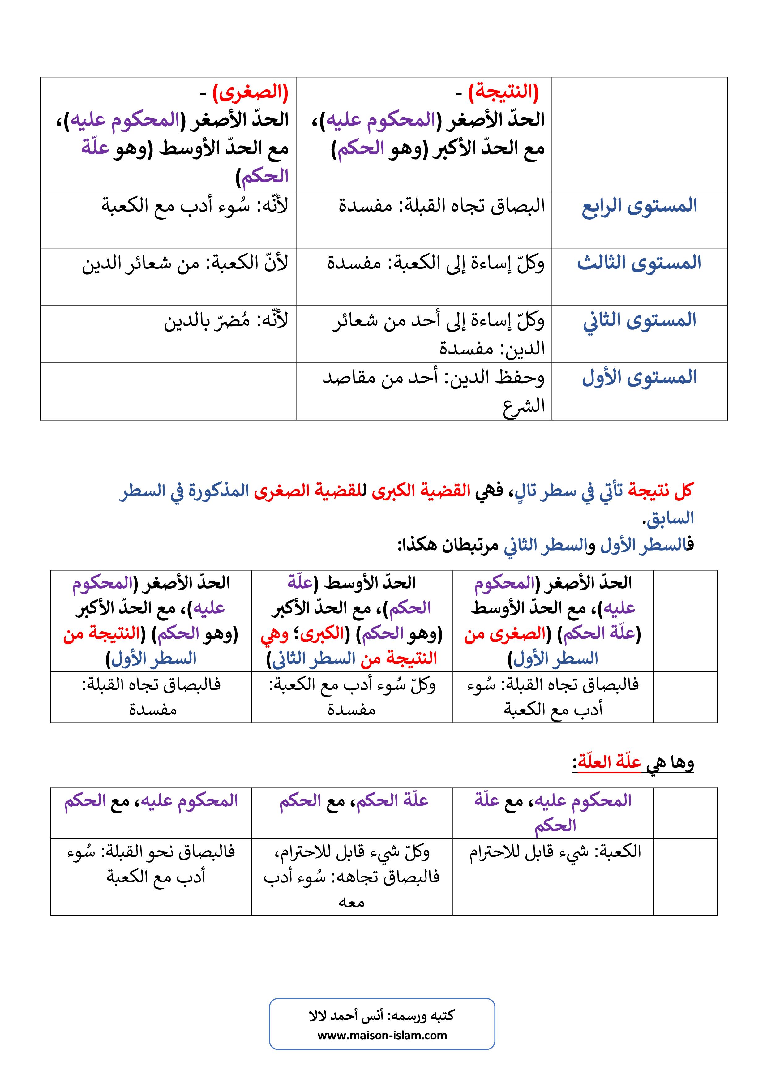 – Echelon II : Ce qui constitue de l'irrespect vis-à-vis de la Kaaba constitue de l'irrespect vis-à-vis du Dîn ; l'irrespect vis-à-vis du Dîn, cela est la Ratio Legis de la règle touchant cette action (hâdhâ 'illat ul-hukm ish-shar'î, wa huwa al-hurma), parce que l'action "faire preuve d'irrespect vis-à-vis de la Kaaba" a été décrétée "constituant de l'irrespect vis-à-vis du Dîn".