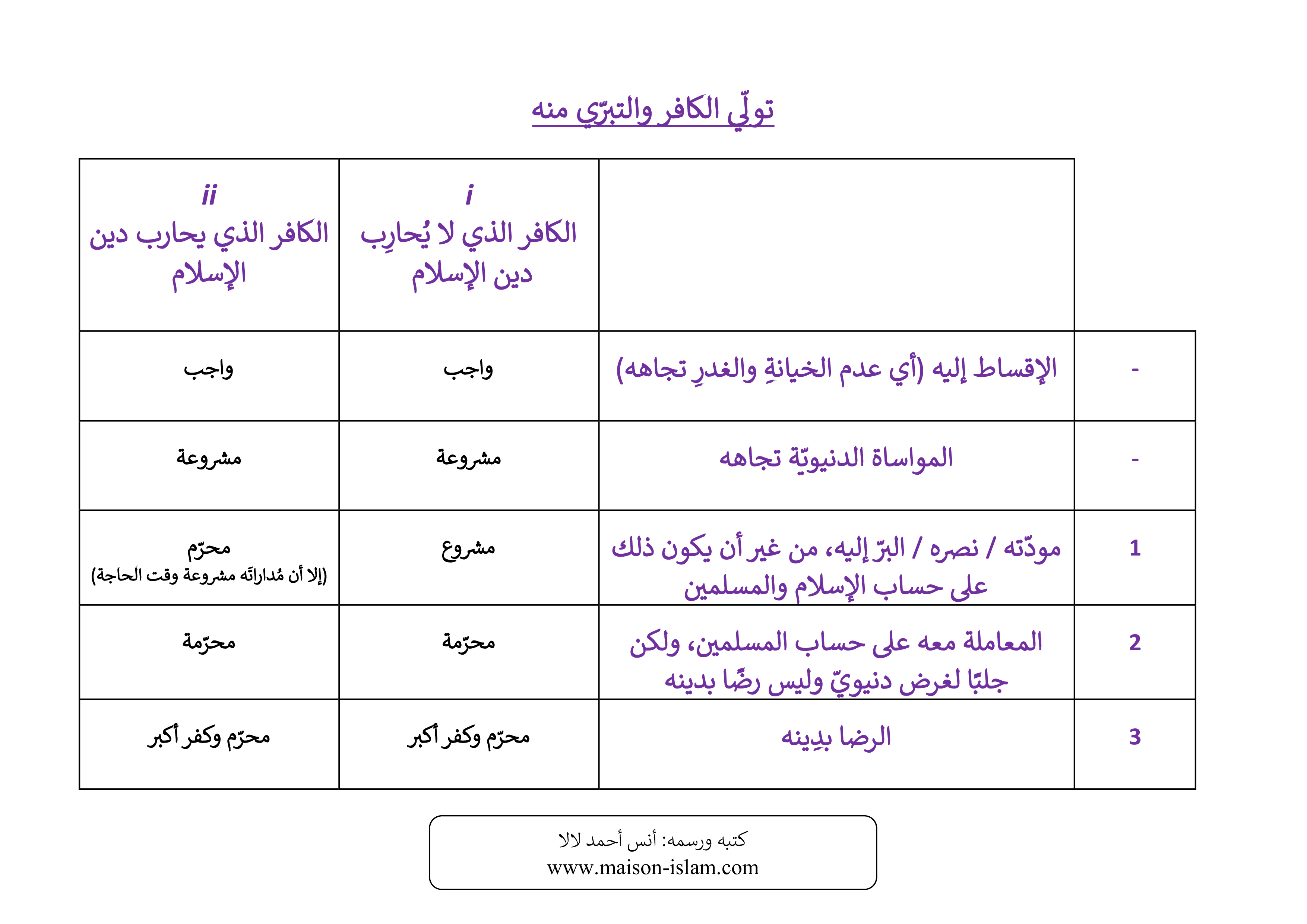 --- De la part du musulman, par rapport à ce non-musulman, la Tawallî d'intensité 2 est également interdite, sans toutefois constituer systématiquement du kufr akbar ; à cette intensité là, c'est également la Barâ'ah qui est nécessaire par rapport à tout non-musulman.